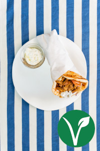 Tous les gyros (pain pita) sont garnis d’une base de tomates, oignons rouges et tzatziki